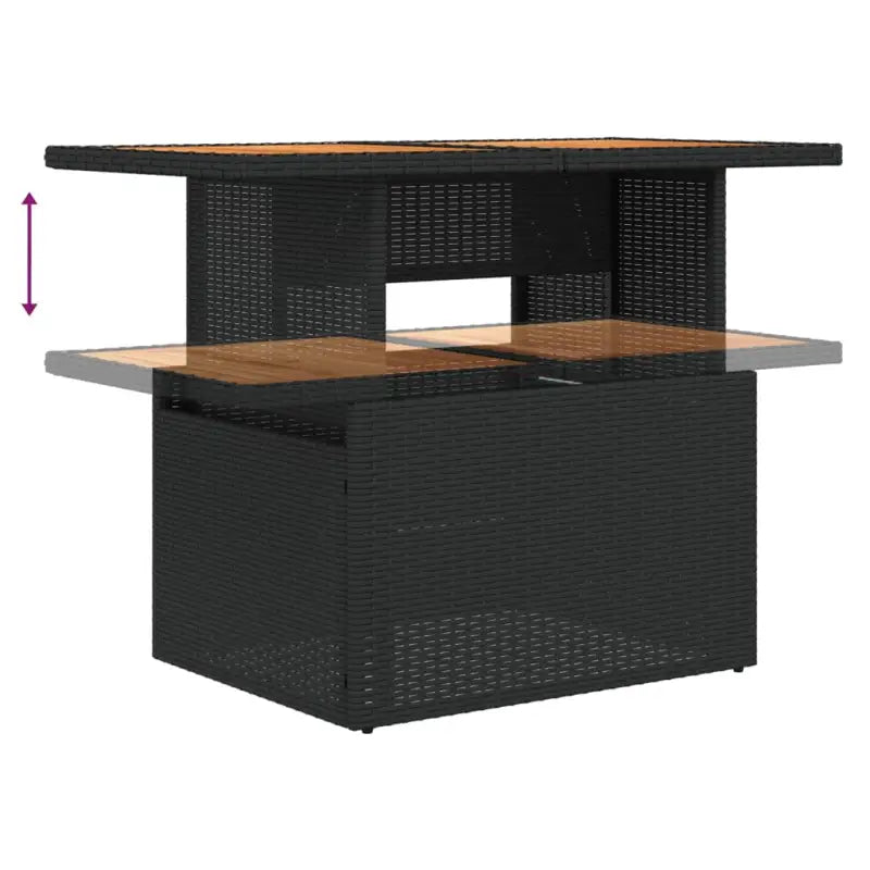 - Verstelbaar tafelblad: het tafelblad kan worden opgetild om de tafel hoger te maken, waardoor de tuintafel verandert van salontafel in eettafel. Hij is perfect om gasten te ontvangen of buiten te eten.