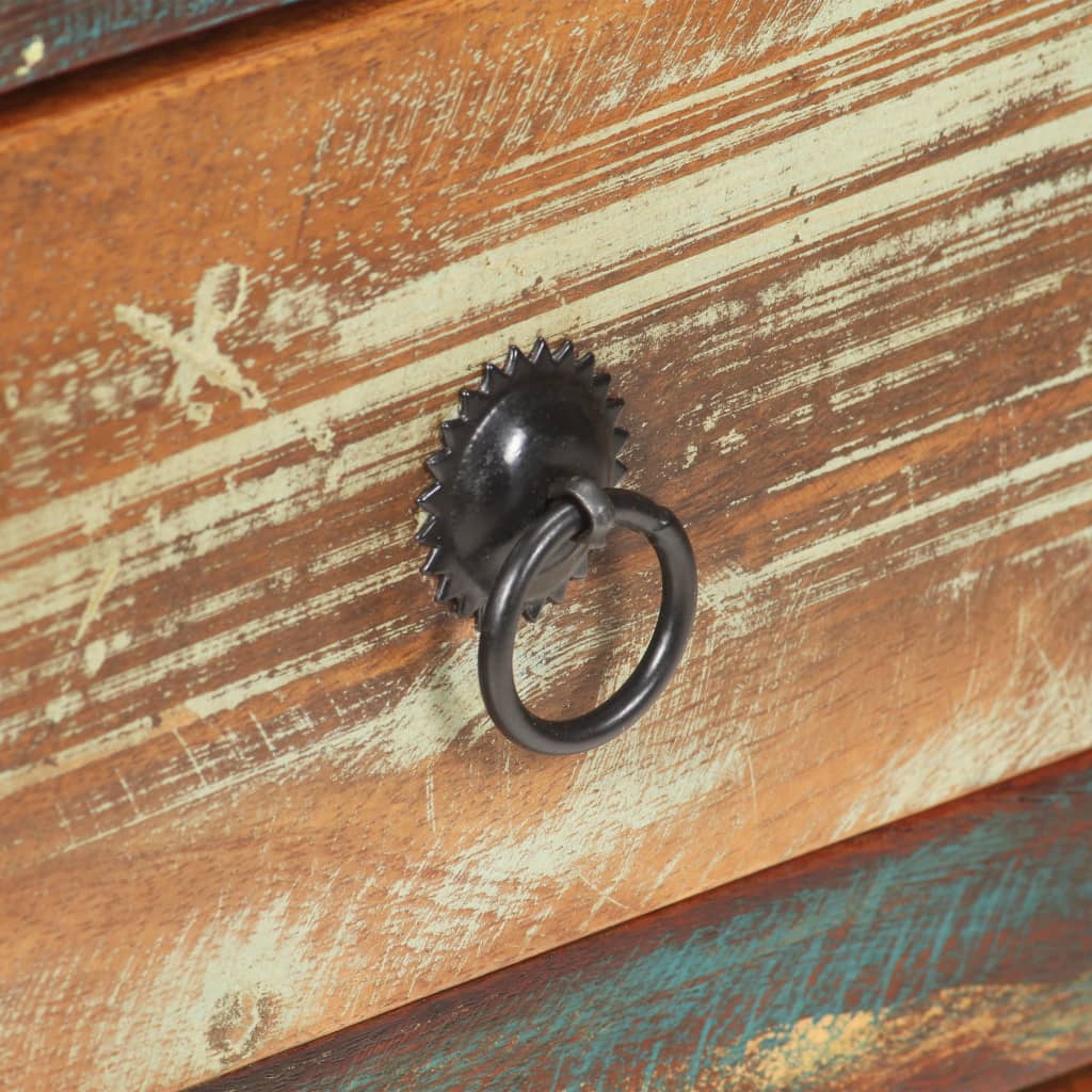 De houten kast is gemaakt van massief hergebruikt hout met meerkleurige afwerking. Dit hout is afkomstig van balken, vloeren en steunbalken van oude gebouwen die afgebroken zijn. Dit hout bestaat uit verschillende houtsoorten, zoals teakhout, hardhout, tropisch hout en mangohout. Dit betekent dat het gerecyclede hout de kenmerken van deze verschillende houtsoorten heeft. Gerecycled hout is al verouderd, verweerd en gedroogd, en krimpt en buigt daarom niet. Deze bijzetkast heeft een deur, een lade en twee schappen die voldoende opbergruimte bieden.