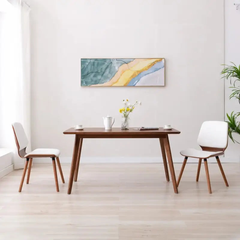 Elke stoel is bekleed met dik gevoerd, gemakkelijk te reinigen kunstleer voor optimaal comfort. Het stevige houten frame heeft een strak en eigentijds ontwerp dat bijdraagt aan zijn unieke stijl. De 4 houten poten zijn sterk en stabiel. Het ergonomische ontwerp van de zitting en rugleuning draagt bij aan het comfort van de stoelen.