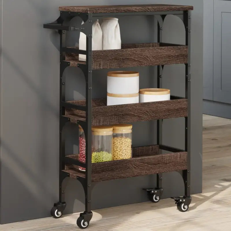 Keukentrolley van bewerkt hout met vintage uitstraling en veel opbergruimte