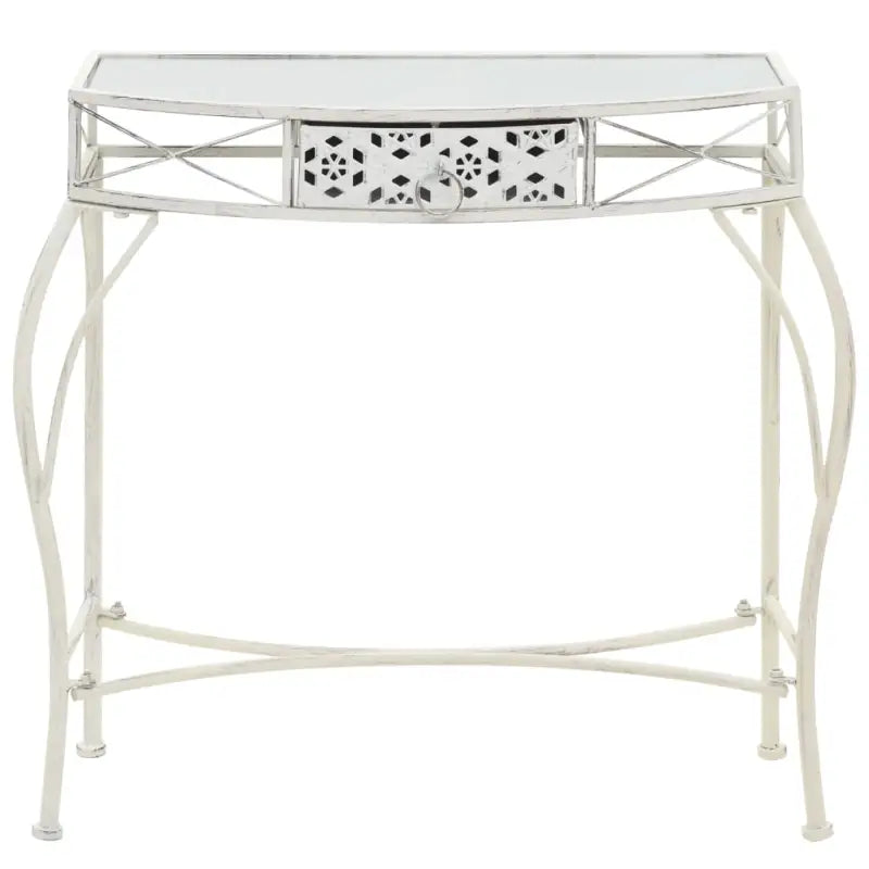 Het tafeltje heeft een metalen frame en een glazen blad, waardoor het stabiel en eenvoudig te reinigen is. De bijzettafel heeft een lade die versierd is met prachtige details die de tafel een antieke stijl geven en een vleugje elegantie in je huis creëren. Het product is eenvoudig te monteren.
