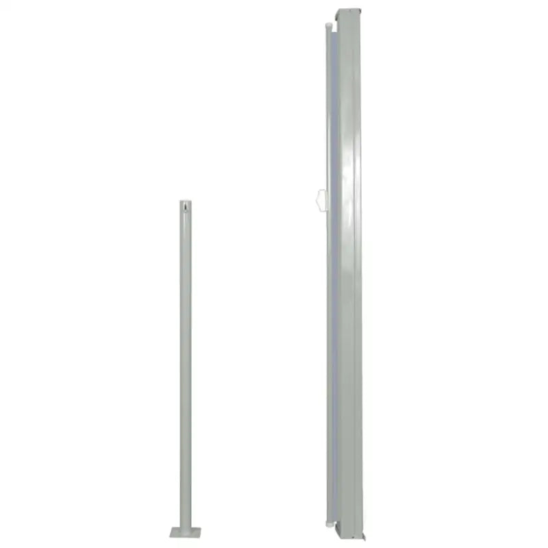 Het scherm is gemaakt van uv- en scheurbestendig polyester. De cassette is gemonteerd op een stevige stalen voet in verticale positie en het uittrekbare scherm kan eenvoudig recht uit de cassette worden getrokken. Het scherm heeft een automatische terugrolfunctie.