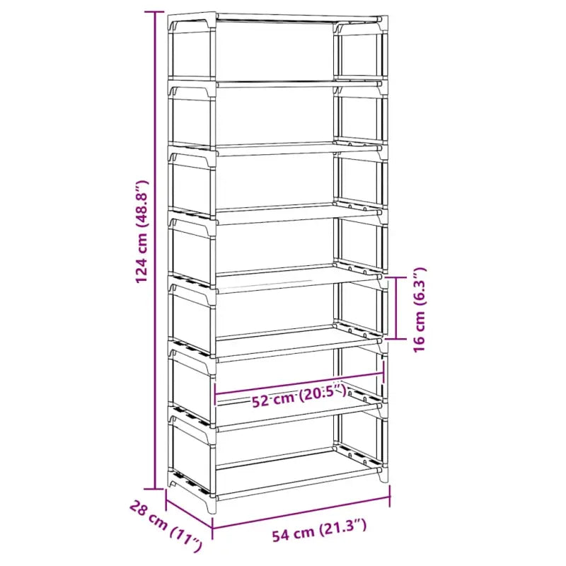 • Voldoende opbergruimte: met zijn 8-laags ontwerp biedt deze schoenenopberger een royale opslagcapaciteit, zodat je je hele schoenencollectie netjes en goed georganiseerd op één handige plek kunt bewaren.