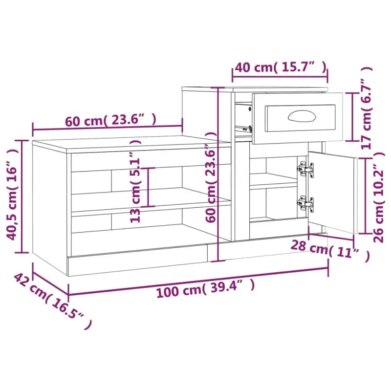 • Schoenenkast afmetingen (lage kast): 60 x 42 x 40,5 cm (L x B x H)