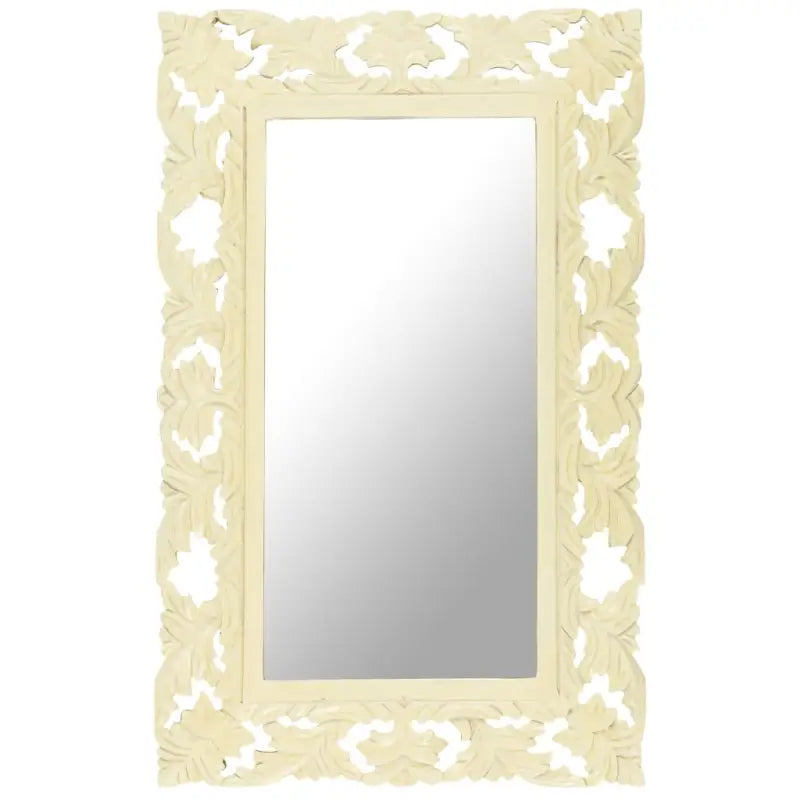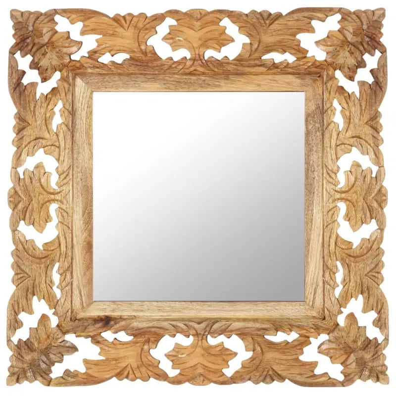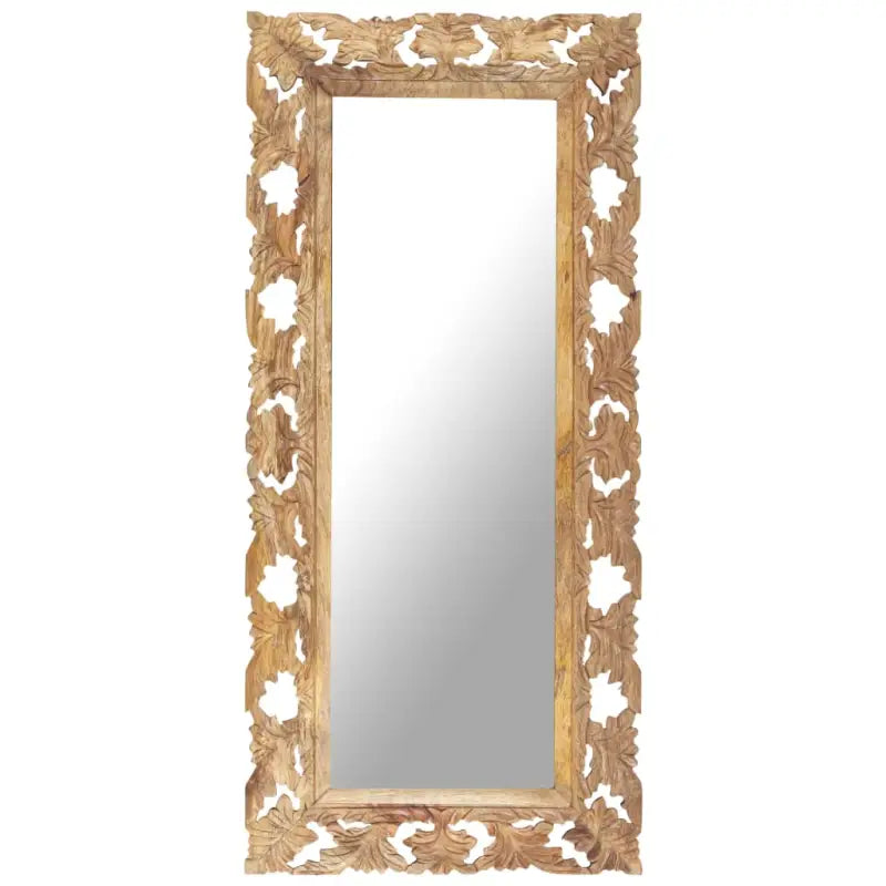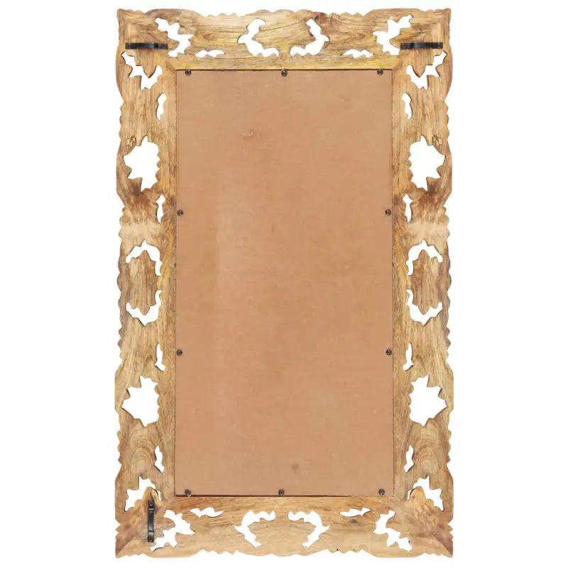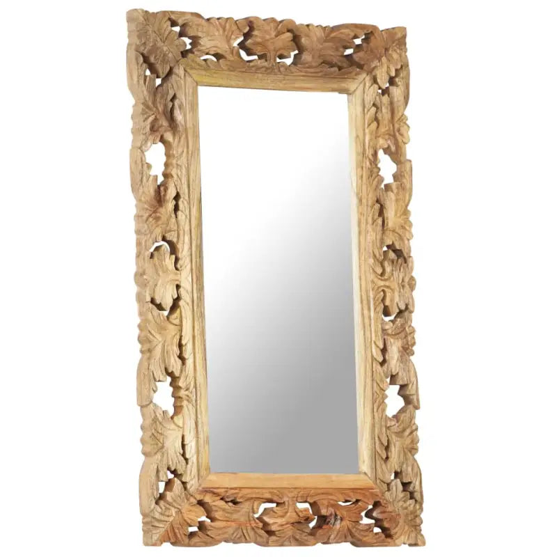 Massief mangohout is een tropisch hardhout. Het heeft de kracht om veel gewicht te dragen en is bestand tegen slijtage. Bovendien zorgen het voortreffelijke vakmanschap en de prachtige houtnerven ervoor dat elke houten spiegel net iets anders is dan de rest. Het met de hand gesneden patroon draagt bij aan de schoonheid.