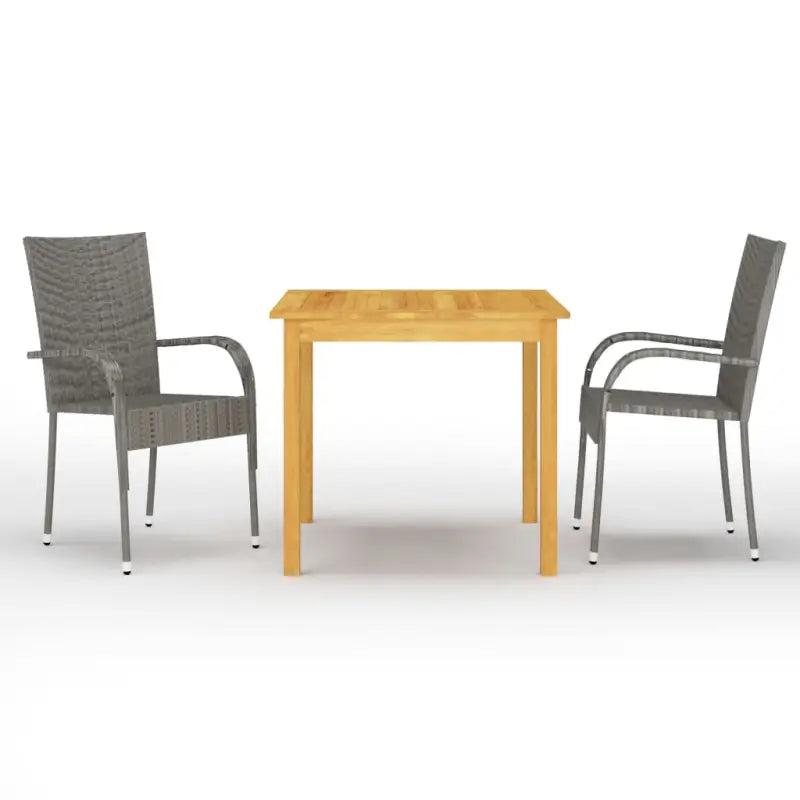 De eettafel is gemaakt van massief acaciahout met een olieafwerking, waardoor hij stabiel, duurzaam en gemakkelijk te onderhouden is. De eetstoelen hebben een gepoedercoat stalen frame bedekt met weerbestendig PE-rattan waardoor ze stevig en gemakkelijk schoon te maken zijn. De buitenstoelen zijn lichtgewicht en kunnen gestapeld worden om ruimte te besparen.