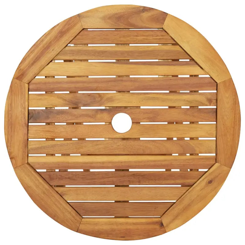 Deze eethoek is gemaakt van massief acaciahout waardoor hij stevig en stabiel is. Het met olie afgewerkte oppervlak is gemakkelijk schoon te maken met een vochtige doek. Het tafelblad heeft in het midden een parasolgat. De eettafel en de stoelen kunnen worden ingeklapt om ruimte te besparen wanneer ze niet worden gebruikt.