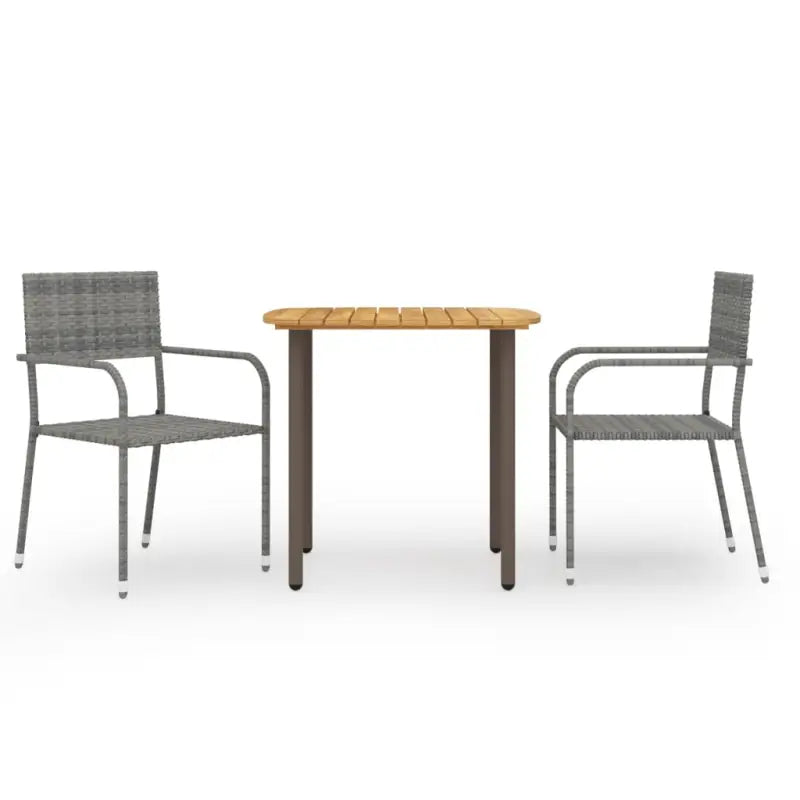 De eettafel is gemaakt van massief acaciahout en duurzaam staal, waardoor hij stevig en stabiel is. Het geoliede oppervlak maakt het meubel geschikt voor buitengebruik. De eetstoelen hebben een stalen frame bedekt met weerbestendig PE-rattan, waardoor ze stevig en eenvoudig te reinigen zijn. Deze tuinstoelen kunnen gestapeld worden om ruimte te besparen wanneer ze niet gebruikt worden.