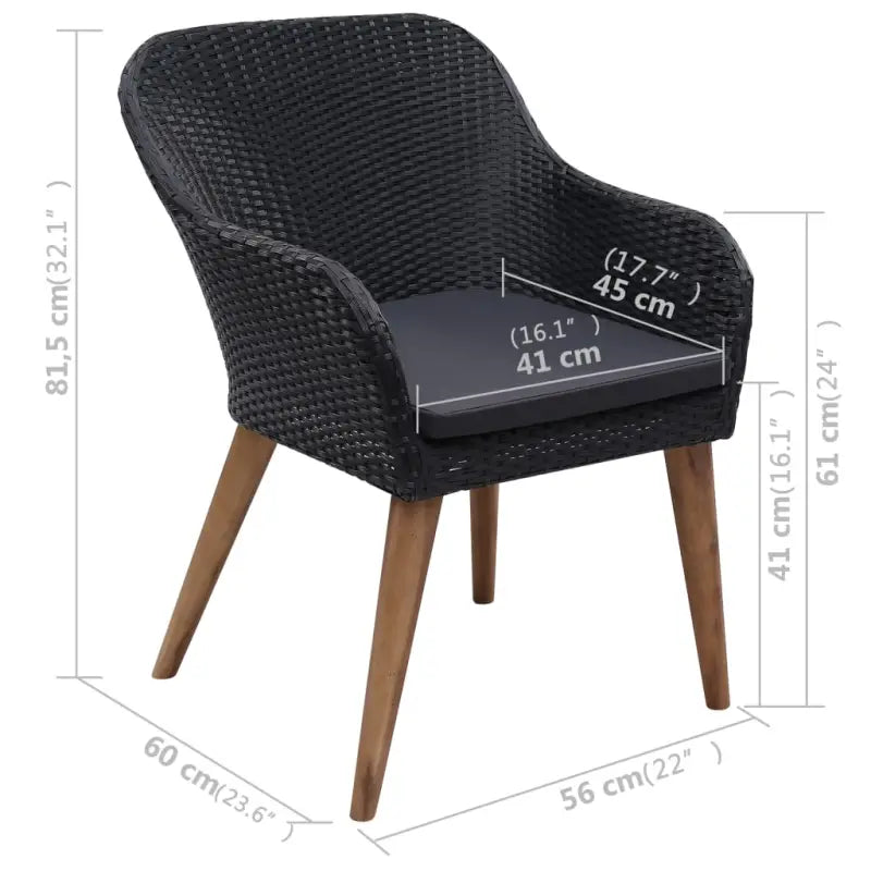 De eettafel is gemaakt van massief acaciahout met een olieafwerking, waardoor hij stabiel, duurzaam en eenvoudig te onderhouden is. De eetstoelen, met een gepoedercoat stalen frame bedekt met weerbestendig PE-rattan, zijn stevig en gemakkelijk schoon te maken. De ergonomisch ontworpen vorm en dik gevoerde kussens zorgen voor het ultieme zitcomfort. De onderhoudsarme polyester kussenhoezen kunnen eenvoudig verwijderd en gewassen worden.