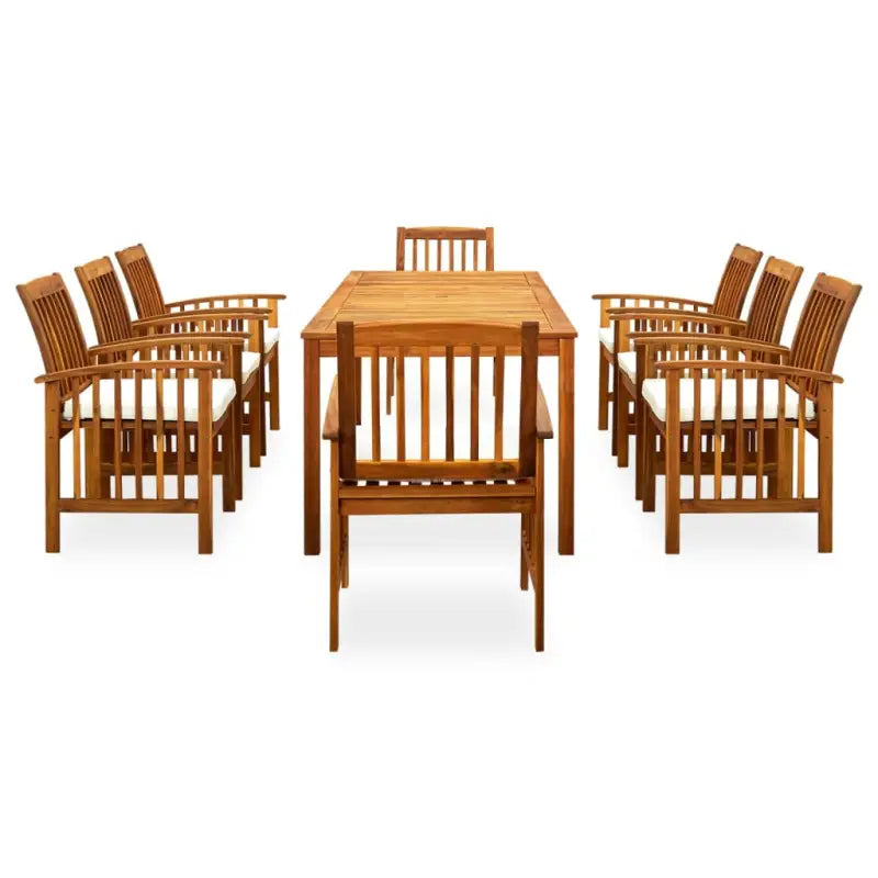 De eettafel is gemaakt van massief acaciahout, een hardhout met dichte nerven dat stevig, duurzaam en onderhoudsvriendelijk is. Het houten tafelblad kan worden gebruikt om eten, drinken en andere spullen op te plaatsen. De klassieke eetstoelen hebben een houten frame met olieafwerking en geven je buitenruimte een natuurlijke uitstaling geven. De dik gevoerde kussens bieden extra zitcomfort. Deze set is eenvoudig schoon te maken met een vochtige doek.