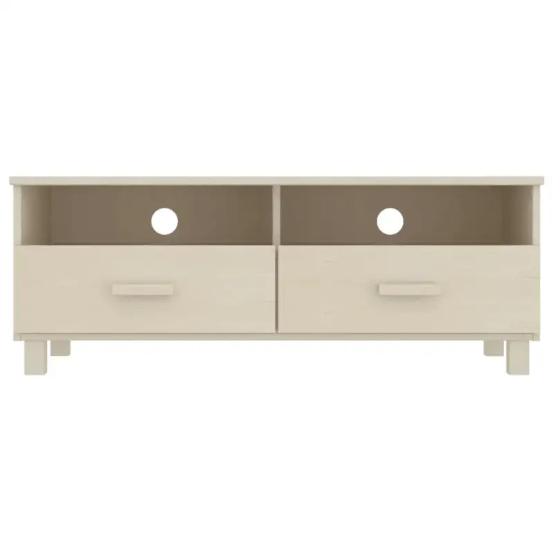 De tv-kast is gemaakt van massief grenenhout waardoor hij stabiel en stevig is. De tv-kast heeft 2 soepel schuivende lades en 2 vakken. Hij biedt dus voldoende opbergruimte om je multimedia-apparaten, boeken en andere items goed georganiseerd en binnen handbereik te houden. Het stevige blad is ideaal voor het plaatsen van decoratieve spullen, zoals fotolijstjes en planten. Dankzij de opening in de achterkant kan je kabels uit het zicht houden.
