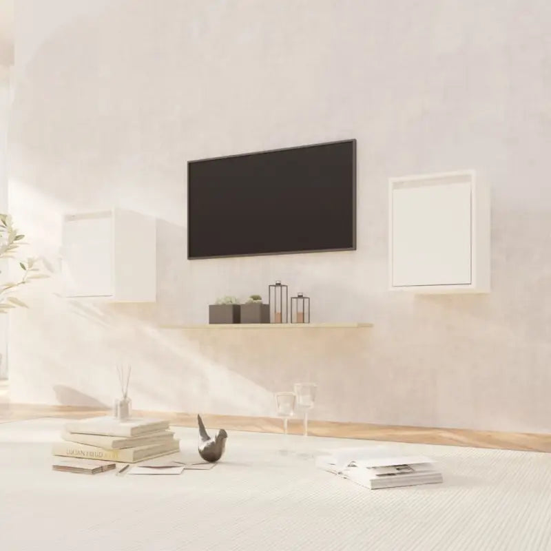 Deze houten wandkasten zijn een decoratieve en praktische toevoeging aan je interieur. Je kunt ze ook als tv-meubel gebruiken.