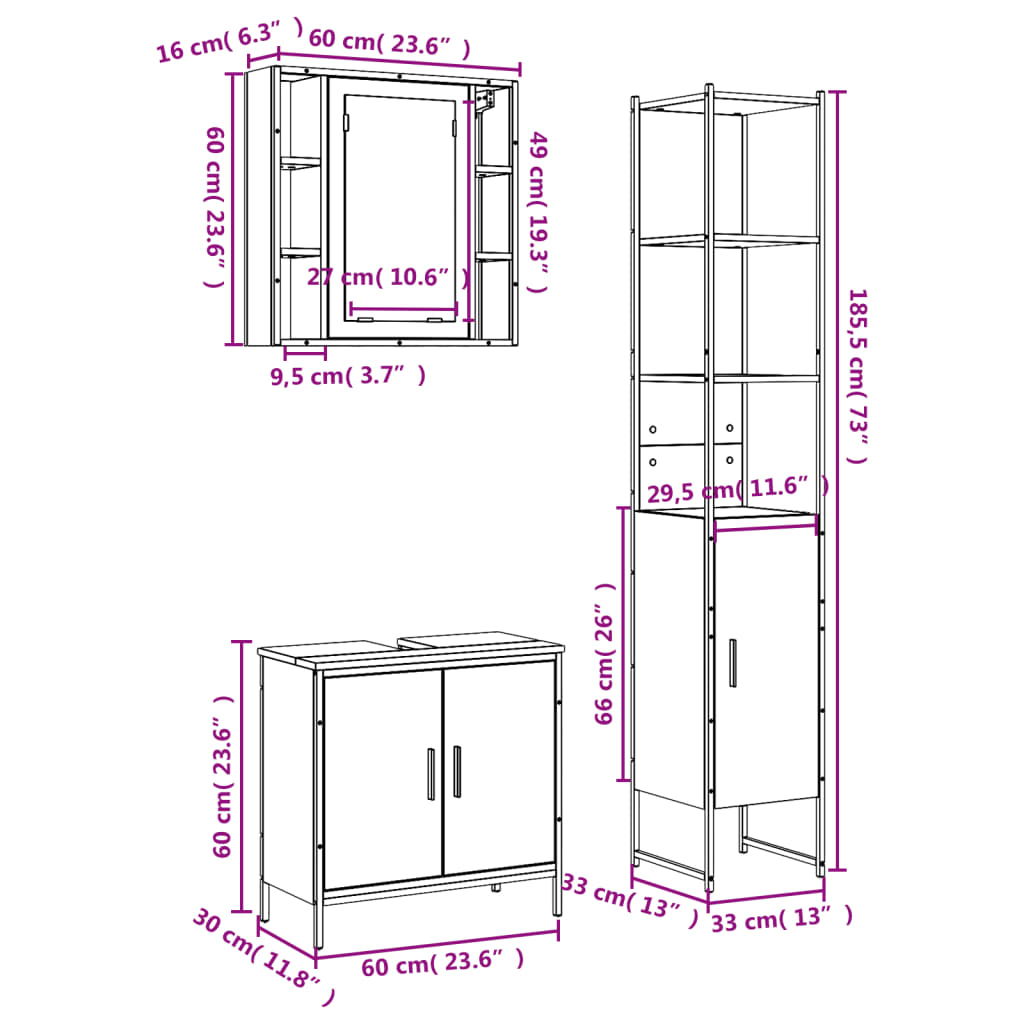 vidaXL 3-delige Badkamerkastenset bewerkt hout zwart