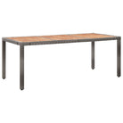 - Materiaal: PE rattan, acaciahouten tafelblad en armsteunen, en gepoedercoat stalen frame